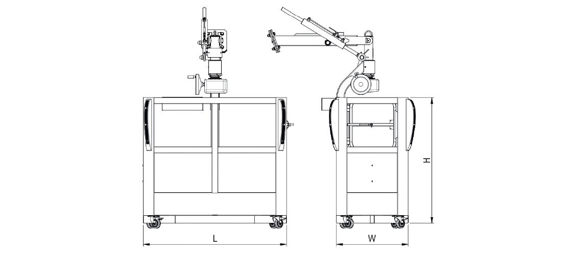 It is equipped with a stabilizing cylinder for smoother movements, a manual or optional electric gearbox allowing rotation, a walk-through entry gate with automatic closure, rubber side bumpers for hand protection and impact resistance, wheels, reflective stickers on the bottom and sides of the basket, a document case, an aluminum tool holder, and an impact protection casing on the gearbox.